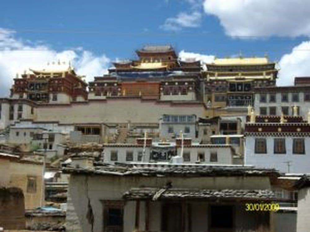 Nach einer schönen Fahrt am Nebenfluss des Yangtze überqueren wir die Provinzgrenze und erreichen nun Shangri-La. Seit 2001 heißt der Ort Zhongdian offiziell Shangri-La. Wir sind wieder zurück in der Zivilisation. Die Klosterstadt Ganden Sumtseling (Songzanlin) gehört selbstverständlich zum Programm. Erhaben glitzern die goldenen Dächer der Tempel. Wir, die es bislang gewohnt waren, die einzigen Besucher im Kloster zu sein – müssen uns nun an den Ansturm bei den Besichtigungsstätten wieder gewöhnen –ach wie schön war es noch, als weit und breit kein anderer Tourist geschweige denn westliche Touristen zu sehen war.