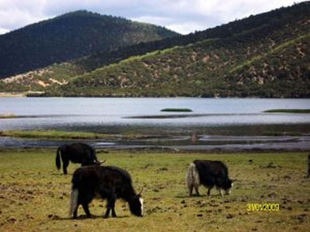 Unweit von Shangri-La ist der Pudacuo-Naturpark gelegen. Bereits auf dem Parkplatz standen zahlreiche Busse und im Wartesaal spitzte sich der Andrang zu. Es gab ein Gerangel, um zu den Bussen zu gelangen. Das Wachpersonal schaffte es trotz Trillerpfeifen und weiterem Personal nicht, die Wartenden in zwei Schlangen zu formen. Nach einer knapp 15-minütigen Fahrt befand man sich im Inneren des Parks. Auf vorgegebenen Wegen ging es im Pulk zum Shudu-See. Die Landschaft ist sehr sehenswert wie bereits auf dem ganzen Weg hierher.