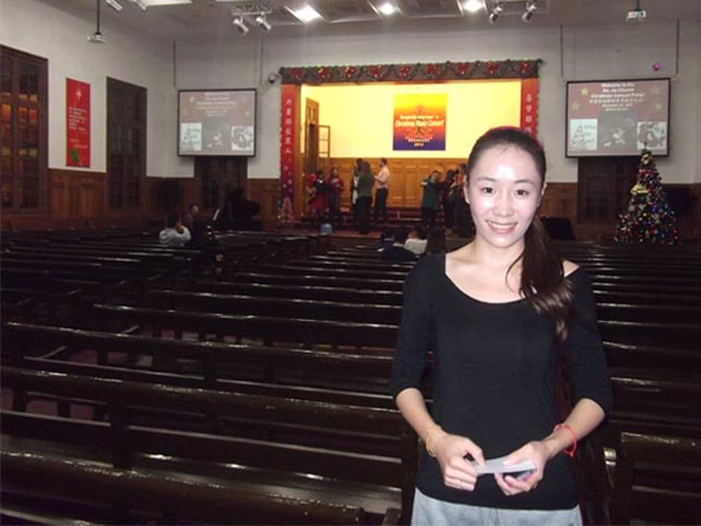 In dieser Kirche, Xin Jie Kirche , schaut sich Miao Miao die letzten Vorbereitungen für die „Christmas Party“ an. Sie ist 22 Jahre alt und arbeitet auf der Insel Gulangyu im Piano Museum. Sich selber bezeichnet sie als „ein wenig christlich“, da lediglich ihre Oma Christin war. An Weihnachten verbringt sie Zeit mit ihren Eltern und sie singen gemeinsam chinesische Lieder. In die Protestantische Kirche geht sie, weil sie in der Nähe der Kirche wohnt – sehr praktisch für sie. Im Gegensatz zu anderen Chinesen weiss sie auch, dass die Geburt Jesus Christus an Weihnachten gefeiert wird. Keine Selbstverständlichkeit.