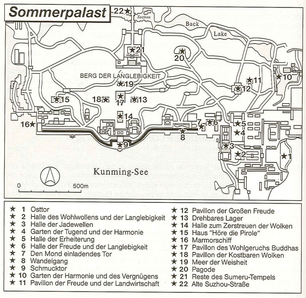 Auf dem 41 Meter hohen „Berg der Langlebigkeit“ (Wanshoushan) steht der „Pavillon des Buddhistischen Wohlgeruchs“ (Foxiangge), von welchem aus man einen tollen Ausblick über den Kunming-See und die gesamte Anlage hat. Zu Fuße des Berges finden Sie die Halle der Freude und der Langlebigkeit, eines der ehemaligen Wohngebäude.
