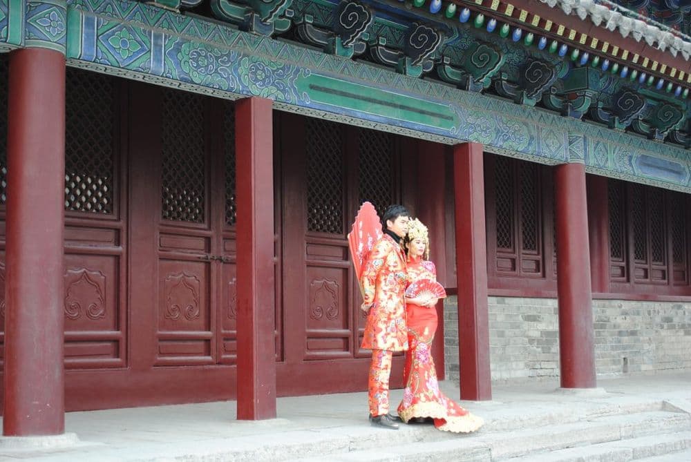 Traditionell heiratet man in China in Rot – der Farbe des Glücks. Heute sieht man häufig Brautkleider nach westlichem Vorbild in Weiß, obwohl die Farbe Weiß immer noch mit Trauer verbunden wird. Während der Hochzeitszeremonie wird die Kleidung aber ohnehin mehrmals gewechselt, wobei das letzte Kleid meist rot ist. Die Hochzeitsfotos werden vor der Hochzeit in speziellen Hochzeitsstudios gemacht. Bei dem oft stundenlangen Prozedere schlüpft das Paar in die ein oder andere Verkleidung und lässt sich dies einige tausend Yuan kosten.