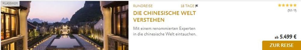 Als Deutschlands China-Spezialist arbeiten wir daran, unseren Kunden regelmäßig innovative Reisekonzepte anzubieten. Mit den brandneuen China Tours Premium-Reisen öffnen wir Ihnen ganz besondere Türen in das Reich der Mitte: gemeinsam mit renommierten Experten erkunden Sie China, erhalten kulinarische Einblicke und übernachten in exklusiven Unterkünften!